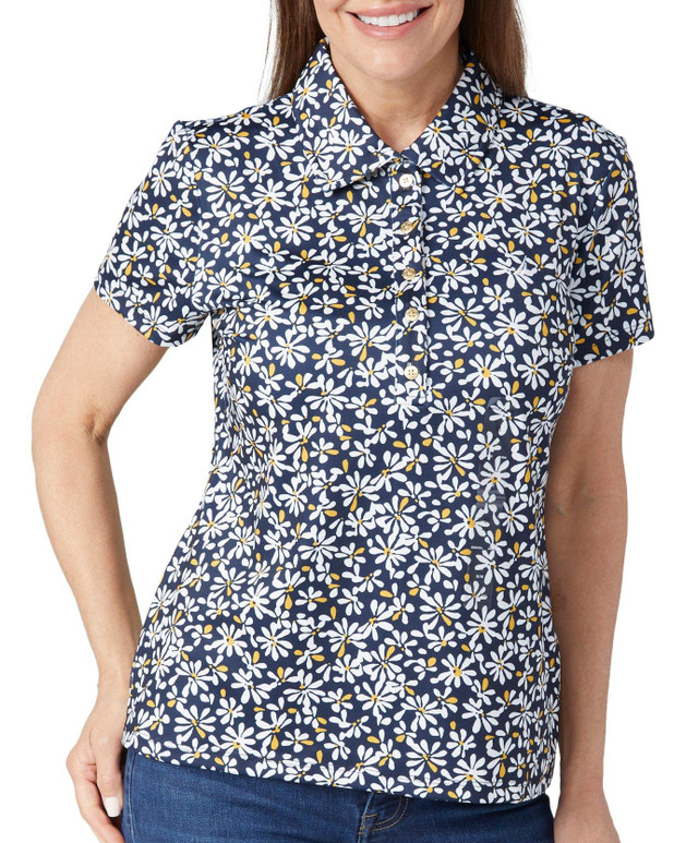 Experience the perfect blend of comfort and style with our Women's Short Sleeve Daisy Soft Touch Polo Shirt. Made from a premium mix of polyester and elastane, this shirt features a daisy print, short sleeves, and a classic polo neckline. The embroidered logo on the chest adds a touch of elegance, making it an ideal choice for both casual and semi-formal occasions.