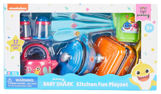 Encourage imaginative play with the 12 Piece Baby Shark Kitchen Fun Playset. Includes skillet, pot with lid, griddle pan, serving pitcher, salt and pepper shakers, tea kettle, tasting spoon, serving spoon and spatula. Designed to inspire role play and social skills while providing hours of interactive fun. For ages 3 years and up.