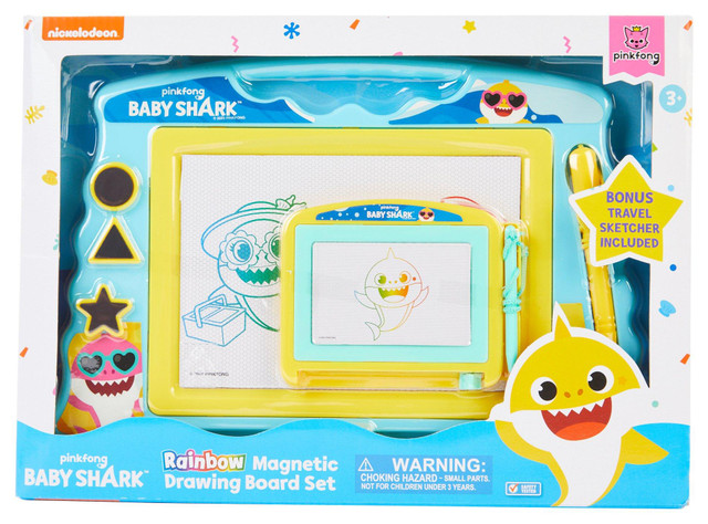 Inspire creative expression with the Baby Shark Rainbow Magnetic Drawing Board Set. Includes a magnetic drawing table, sliding eraser, attachable stylus, three magnetic stampers, mini magnetic drawing tablet, sliding eraser, attachable stylus and a bonus travel sketcher. Perfect for artistic play at home or on the go. For ages 3 years and up.