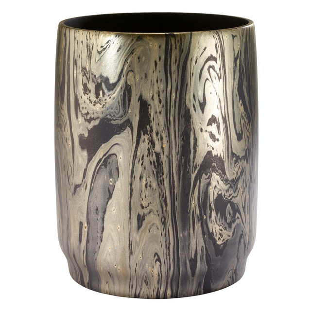 The Nicole Miller Harper Wastebasket is decorated with a beautiful gold and black marble-look decal that wraps entire piece. The water decal process makes each piece unique, adding to the beauty of the collection. Made of durable resin for easy care and long life. Perfect for any room in the house. Measures 7.68 in. x 7.68 in. x 10.00 in.