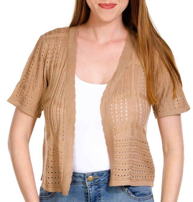 This short sleeve shrug features a solid color design on soft lightweight open knit fabric, a scallop trim, and clssic styling. The top length measures approximately 21 in. Fabrication 100% acrylic.