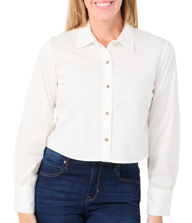 Add a trendy touch to your wardrobe with this Women's Long Sleeve Button Down Top. Designed in a solid lightweight fabric, it features a classic collared neckline, button-down front, and chic cuffed long sleeves. Perfect for dressing up or down with ease. Fabrication 70% cotton, 27% nylon, 3% elastane.