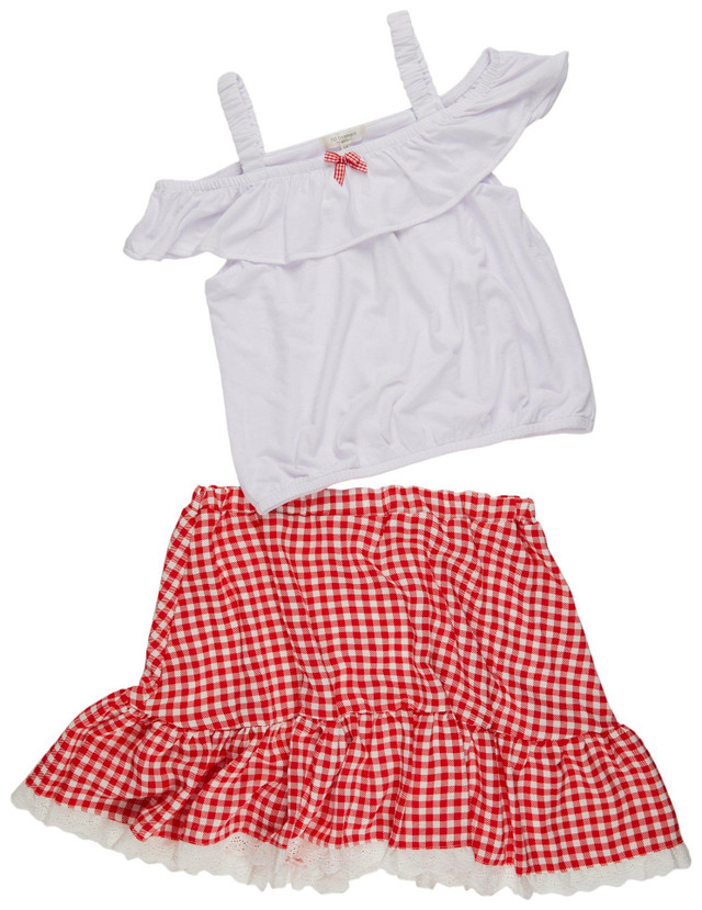 Introducing the Big Girls 2 Pc Gingham Skirt Set, a stylish and trendy outfit perfect for any occasion. Made from a blend of polyester and spandex, this set includes a solid cold shoulder top that adds a modern touch. Paired with a charming gingham print skirt, it offers a coordinated and fashionable look. Ideal for casual outings or special events, this set combines comfort and style effortlessly.