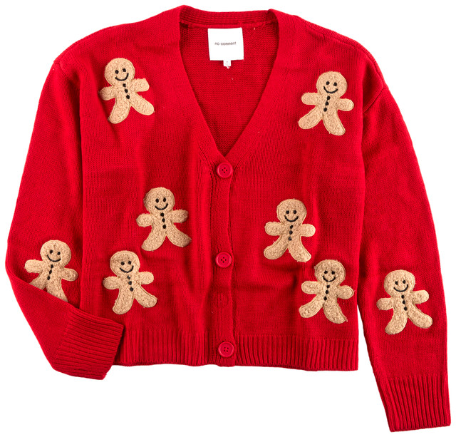 Sweeten up your holiday style with this juniors button-down cardigan featuring a playful gingerbread man design. Cozy and festive, its perfect for layering over your favorite looks all season long. Fabrication 100% acrylic