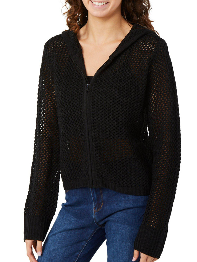 Stay stylish with the Juniors Knit Zip Up Jacket. Featuring a breathable knit body, this solid-colored jacket includes long sleeves, a hooded neckline, and a full zip front. Fabrication 100% acrylic