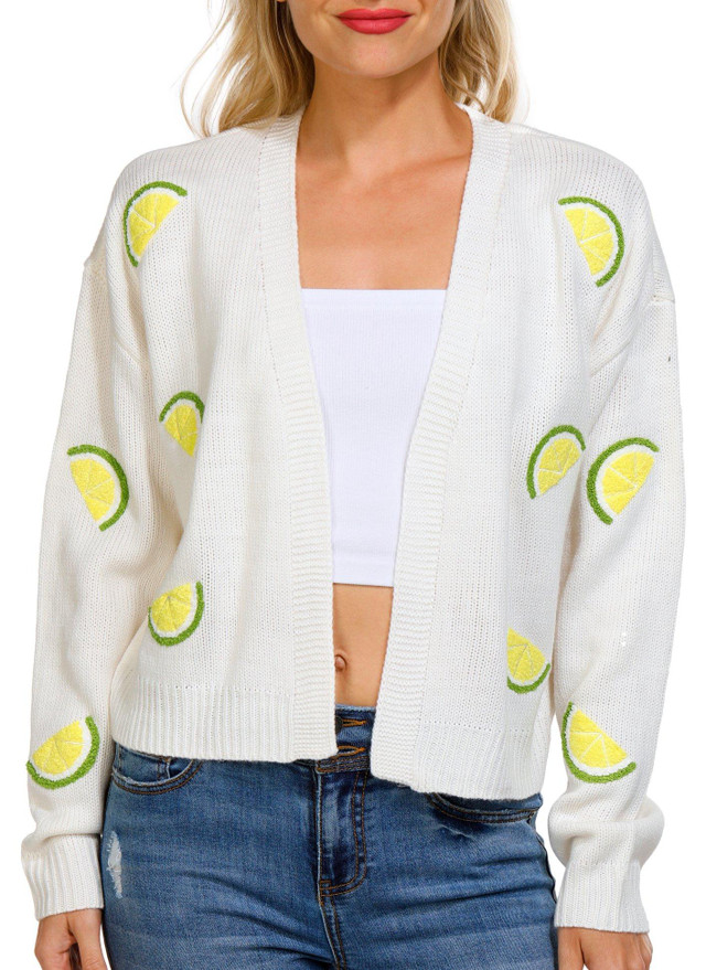 Add a playful touch to your wardrobe with our Juniors Lemon Slice Patch Cardigan, made from 100% acrylic for cozy comfort. This charming cardigan features unique lemon slice patches, a button-down closure, and a 20-inch length, making it perfect for layering over your favorite tops. Whether you're heading out for a casual day or looking to brighten up your outfit, this cardigan offers a fun and stylish option.