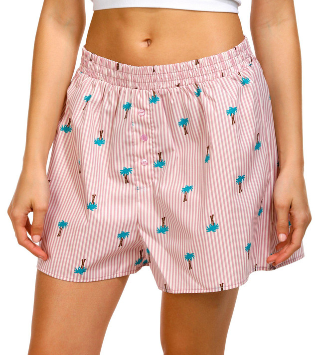 Introducing the Juniors Palm Tree Stripe Boxer Shorts, made from a blend of polyester and cotton for a soft and comfortable feel. These shorts feature a playful stripes and palm tree print, perfect for a fun and casual look. The elastic pull-on waistband ensures a snug fit and easy wear. Ideal for lounging or casual outings, these boxer shorts combine style and comfort effortlessly.