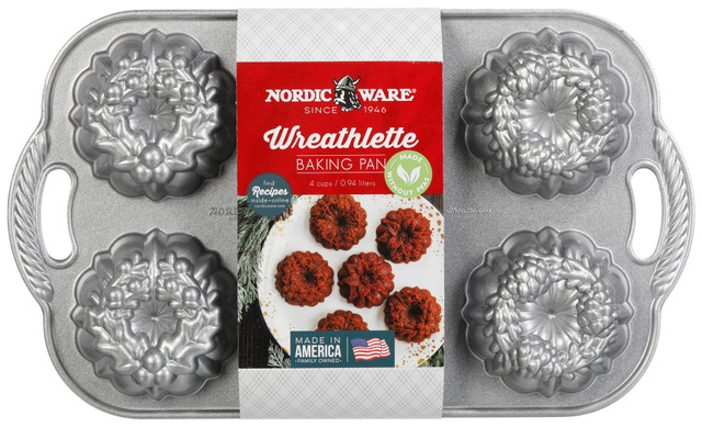 Bake festive treats with this 4-cup Wreathlette Baking Pan, designed to create six beautifully detailed wreath-shaped cakes or muffins. Made from heavy cast aluminum, it ensures even heating and long-lasting durability. The pan is free from PFAS and other harmful chemicals, making it a safer choice for your kitchen.