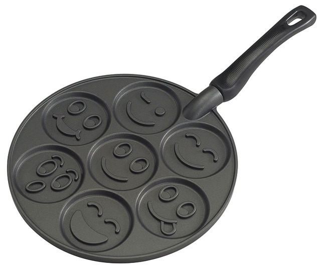 Make smiley design pancakes with this Nordic Ware Smiley Face Pancake Pan that are sure to brighten any day. Cast aluminum pan features a PFOA-free nonstick coating. 17.5''L x 10.5''W x 2.25''H.