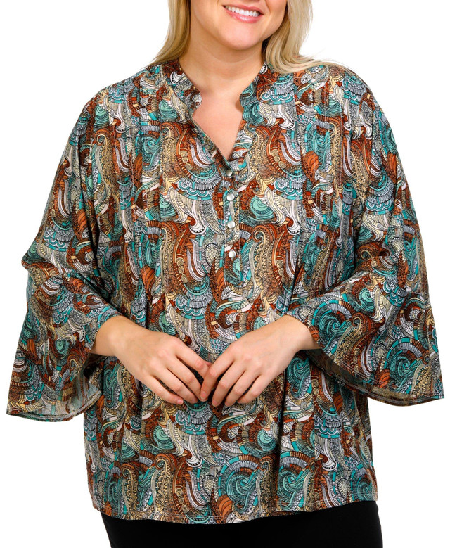The 3/4 Sleeve Top is a perfect blend of elegance and comfort. Crafted from jacquard knit fabric, this top offers a unique texture and visual appeal. The buttoned neckline adds a classic touch, while the bell sleeves provide a stylish and feminine flair. Ideal for both casual and semi-formal occasions, this versatile top ensures you look chic and feel comfortable. Fabrication is 95% polyester, 5% spandex.
