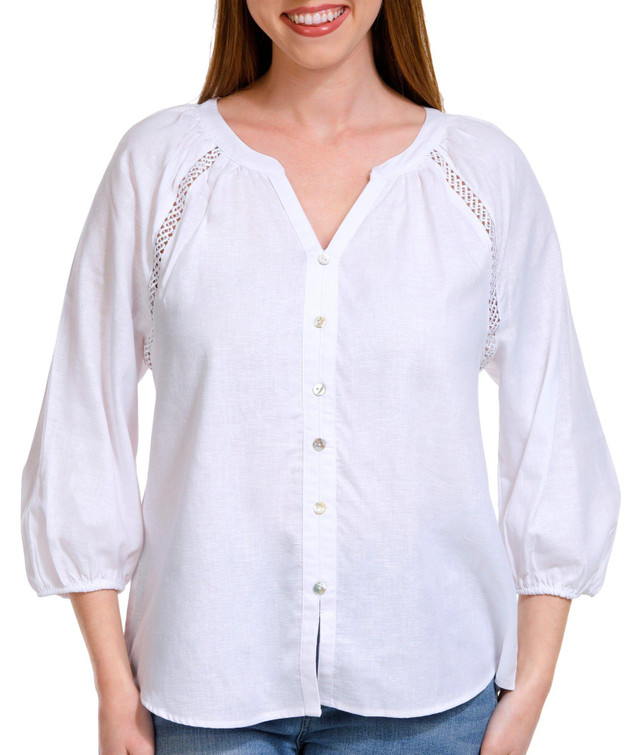 The Petite Solid Button Front 3/4 Sleeve Top is made from a soft and breathable blend of 40% cotton, 30% Tencel, and 30% linen, offering a lightweight and comfortable fit. The button-front design and 3/4 sleeves provide a classic yet modern touch. In a solid color, this top is versatile and easy to pair with any outfit, perfect for casual outings or layering. It combines comfort and style effortlessly.