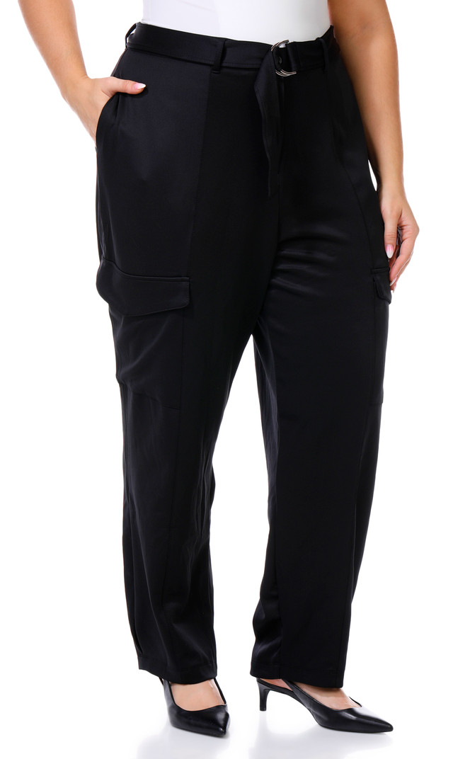 These plus size cargo scuba pants feature a solid color design with a fashion belt and multiple pockets for style and convenience. Button and fly closure complete the look, offering a comfortable, versatile option for casual and everyday wear. Inseam is approximately 29.5 in. Fabrication is 95% polyester and 5% spandex.