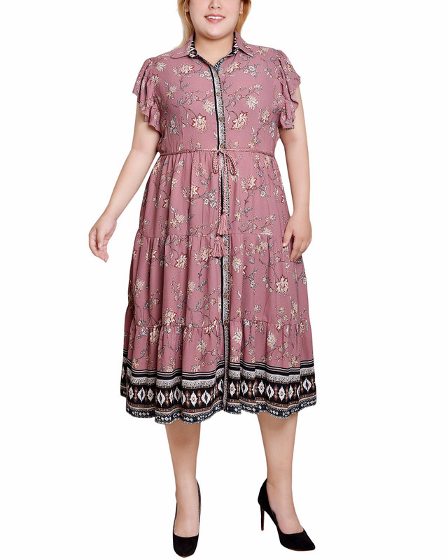 Step into timeless elegance with this classic tiered dress, featuring a button front and a chic tassel belt. The spread collar and border print design add a touch of sophistication, while the dobby fabric ensures comfort and style. Perfect for both work and lunch outings with friends, this dress effortlessly combines classic charm with modern flair. Embrace a sophisticated look that transitions seamlessly from office to social gatherings. Length 46 in. Fabrication 100% polyester.