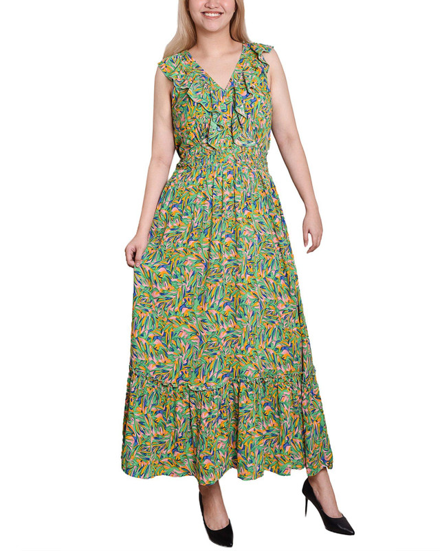 Elevate your wardrobe with this stunning chiffon maxi dress. It features a deep v-neckline with delicate ruffle details, a smocked waist that accentuates your figure, and a tiered hem for a playful touch. Perfect for a fun, flirty, and fashion-forward look, this versatile dress is ideal for both work and casual outings with friends and family. Embrace effortless elegance and make a statement wherever you go! Length 53 in. Fabrication 100% rayon.