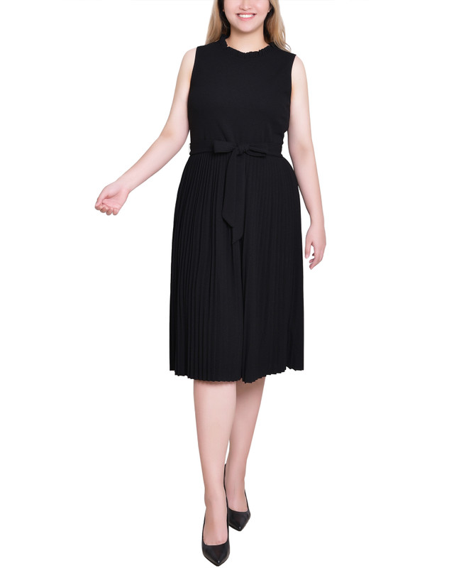 Make a bold statement in this NY Collection sleeveless crepe dress. Featuring a vibrant color, soft chiffon fabric, and a flattering elastic waistband with a tie belt, its designed to turn heads. The pleated skirt and ruffle neckline add a feminine flair, perfect for day-to-night wear. Dress length approximately 38 in.