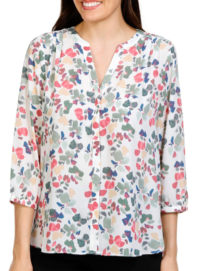 Introducing the Petite 3/4 Sleeve Pintuck Blouse, crafted from 100% polyester for a lightweight and comfortable fit. This stylish blouse features a chic print and a split neckline, perfect for both casual and dressy occasions. The button-down front and 3/4 sleeves add a touch of elegance, while the pleated detail on the back enhances the overall design. Combining fashion and functionality, this blouse is a versatile addition to your wardrobe.