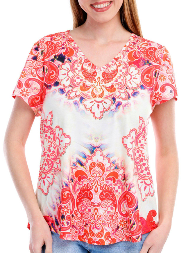 Introducing our Petite Mandala Rhinestone Short Sleeve Top, crafted from a blend of polyester and spandex for a comfortable and flexible fit. This top features a stylish mandala print adorned with rhinestone embellishments, adding a touch of sparkle to your look. The v-neckline and short sleeves provide a classic and flattering fit. Perfect for any casual or semi-formal occasion, this top combines elegance and comfort effortlessly.