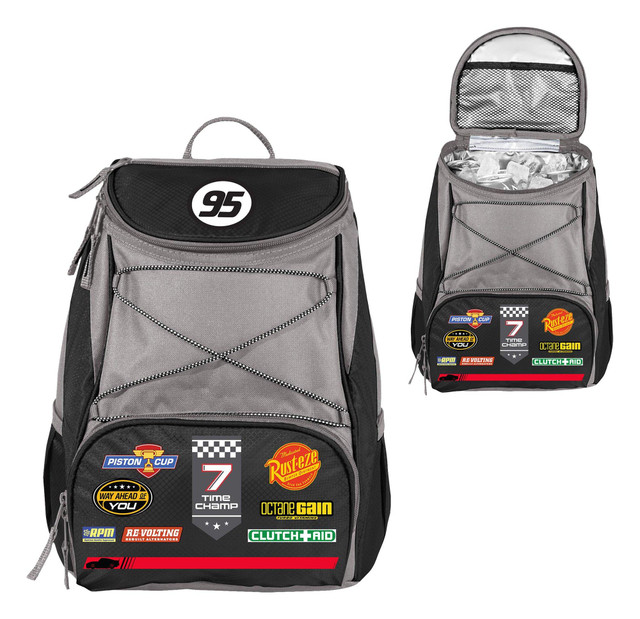 The PTX Backpack Cooler with Disney Cars Lightning McQueen features a fully-insulated interior liner that is also water-resistant, you can use it as a food and beverage tote or as an all-around activity tote. Backpack also features golf cart harness, five separate pockets, and front-mounted stretch cord. 20 can capacity. Measures: 11'' x 7'' x 12.5''.