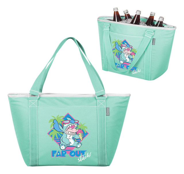 The Topanga cooler tote is made of durable polyester with Disney Lilo & Stitch decoration and features a separate exterior pocket. Interior features heat-sealed PVC for no leaks and it is large enough to carry 24 soda cans. Measures: 21'' x 8.7'' x 13''.