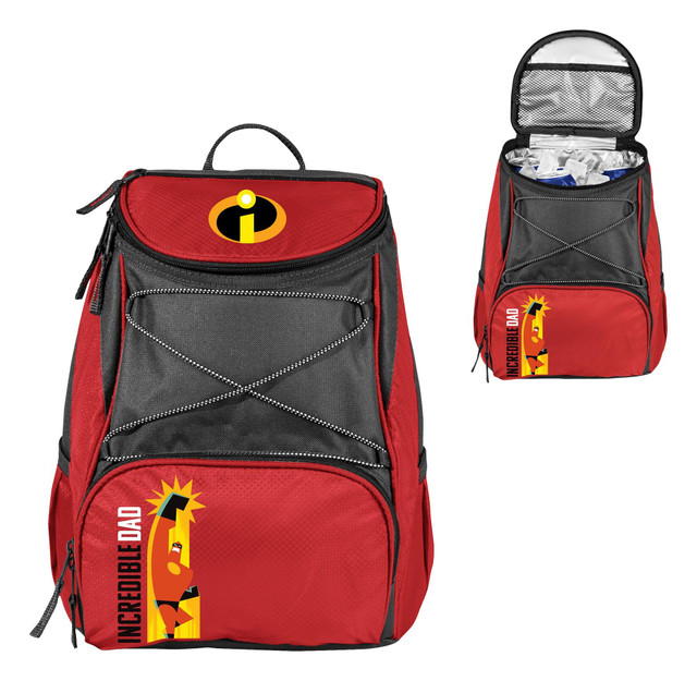 The PTX Backpack Cooler with Disney Mr. Incredible design features a fully-insulated interior liner that is also water-resistant, you can use it as a food and beverage tote or as an all-around activity tote. Backpack also features golf cart harness, five separate pockets, and front-mounted stretch cord. 20 can capacity. Measures: 11'' x 7'' x 12.5''.
