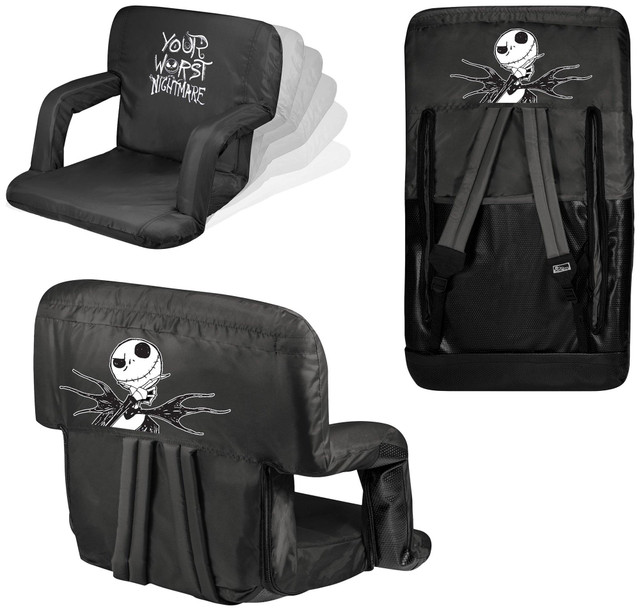 The Ventura Seat by Oniva is a portable recreational recliner with armrests and adjustable backpack straps you can take just about anywhere. Seat features Nightmare Before Christmas Jack design, six backrest positions, and integrated armrests. Measures 20''L x 32''W x 32''H. Weighs 7.5 lbs.