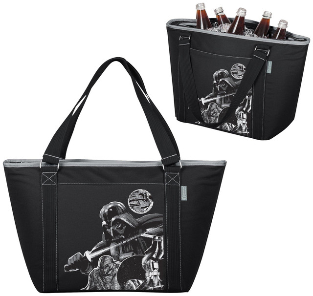 The Topanga cooler tote is made of durable polyester with Disney Star Wars Darth Vader Comic decoration and features a separate exterior pocket. Interior features heat-sealed PVC for no leaks and it is large enough to carry 24 soda cans. Measures: 21'' x 8.7'' x 13''.