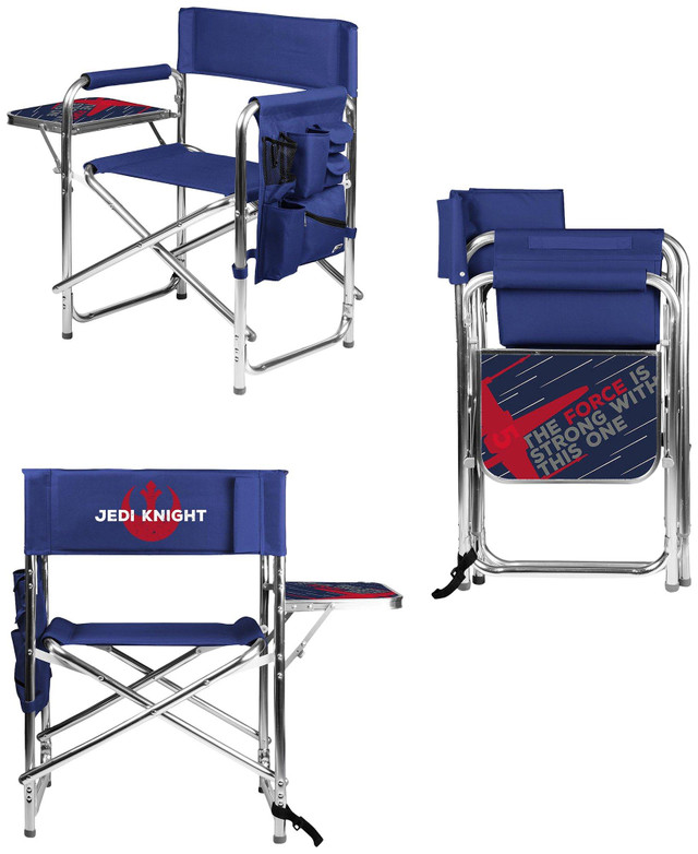 The Star Wars Jedi Knight Folding Sports Chair by Picnic Time features a sturdy aluminum frame, adjustable detachable shoulder strap, side pockets, & insulated drink holders. Chair features 19.5'' wide seat and holds up to 300 lbs. Folded measures 19 x 4.5 x 33 inches and expanded measures 19 x 24 x 33. Side table measures 14.5 x 11 inches and holds up to 10 lbs.