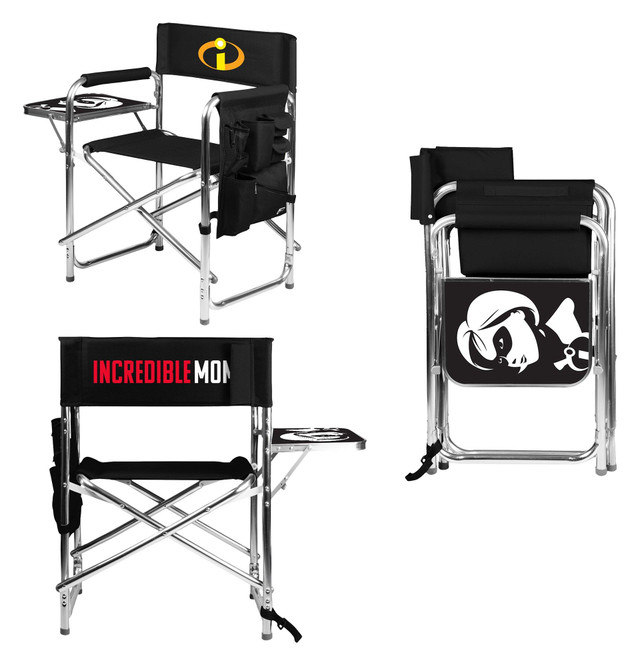 The Disney The Incredibles Elastigirl Folding Sports Chair by Picnic Time features a sturdy aluminum frame, adjustable detachable shoulder strap, side pockets, & insulated drink holders. Chair features 19.5'' wide seat and holds up to 300 lbs. Folded measures 19 x 4.5 x 33 inches and expanded measures 19 x 24 x 33. Side table measures 14.5 x 11 inches and holds up to 10 lbs.