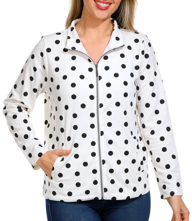 Elevate your style with our Zipped Long Sleeve Jacket, featuring a playful polka dot print that adds a touch of whimsy to any outfit. Designed for both comfort and functionality, this jacket boasts double front pockets, perfect for keeping your essentials close at hand. Whether you're heading out for a casual day or a night on the town, this versatile piece will keep you looking chic and feeling cozy. Fabrication is 89% polyester, 8% rayon, and 3% spandex.