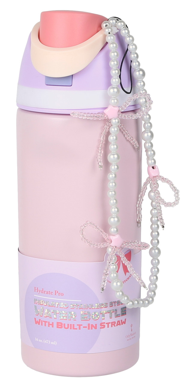 Stay refreshed on the go with this insulated stainless steel water bottle. The double wall design keeps drinks cold or hot for up to 24 hours, while the built in straw, carry loop, and push button opening make it easy to use anywhere. Leak proof when locked and includes a coordinating keychain with pink bows for a fun finishing touch. Measures approximately 9 in x 3 in. Capacity is 16 oz.
