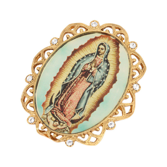 Introducing our classic pin, featuring an elegant oval decal of Our Lady of Guadalupe. Adorned with round clear crystal accents, this piece is perfect for special occasions. It beautifully combines faith and inspiration, making it a meaningful accessory that adds a touch of grace and elegance to any outfit. Length 1.9 in., width 41mm.