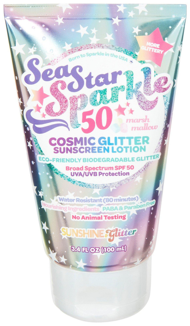 Practice safe sun combating both the sun's rays and environmental stressors. Fun eco-friendly biodegradable glitter lotion for your little one. Marshmallow scent. Water resistant (80 min.)