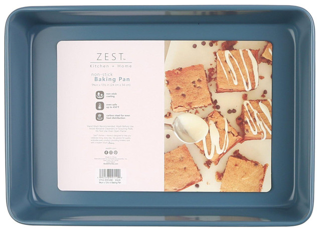 Zest Kitchen + Home produces sophisticated home products and textiles with an international sense of style and quality. This high-quality baking pan is oven safe up to 450 degrees, features a smooth nonstick coating and is composed of carbon steel for even heat distribution. Measures 9-5/8in x 13.5in and is 2.5in deep.
