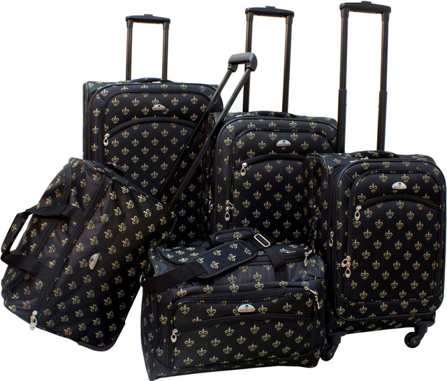 American Flyer Fleur De Lis Luggage Set includes 28'', 24'', & 20'' expandable spinner uprights as well as wheeled duffel (17.5'' x 11''x 10') & personal bag (17''). The suitcase uprights feature 4 spinner wheels, locking telescoping handle, large exterior pockets, and top & side handle.