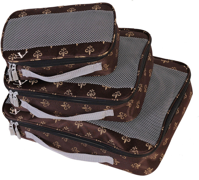 This 3-pc. Perfect Packing System features double strap zipper pull, mesh top for easy looking & ventilation, sturdy piping, and strap handle to carry. Set includes 3 cubes 17.5'' x 13 x 3.5'', 14'' x 10'' x 3.5'', and 12'' x 7.5'' x 3''.