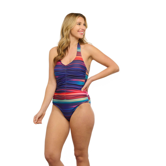 Introducing our vibrant one-piece swimsuit, featuring a multi-striped design and halter styling with an adjustable neck tie. The front ruching detail enhances the flattering silhouette, making it perfect for sporty and active days. Ideal for the beach, pool, or resort, this fun and colorful swimsuit is a must-have for fashion-forward individuals. Embrace a blend of style and comfort with this eye-catching swimwear piece.