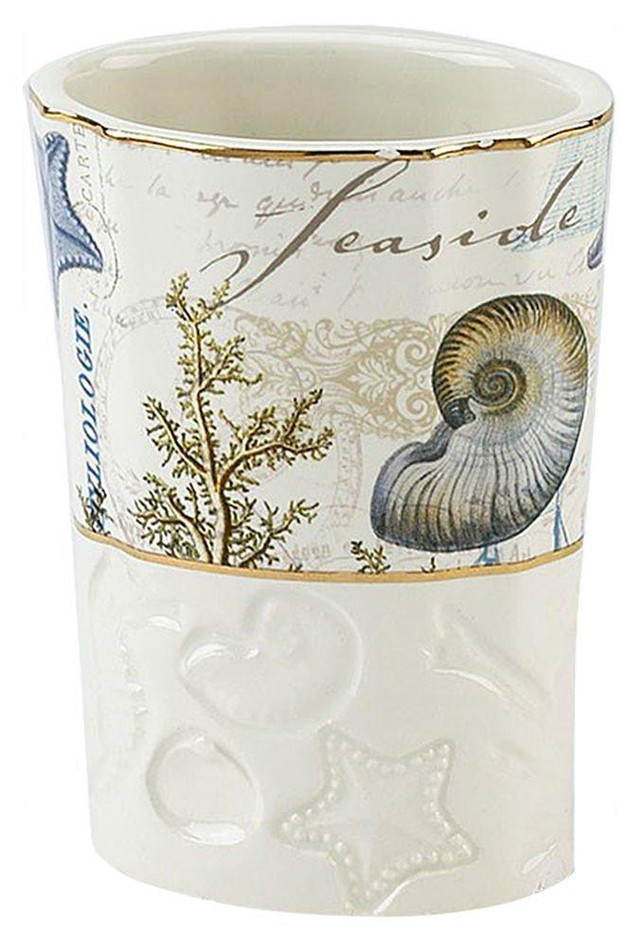 Featuring a seaside design, Antigua ceramic tumbler by Avanti is a luxurious addition to your coastal décor. Coordinates with the Antigua bath accessories collection for a finished look. Decorative tumbler measures approximately 6.25'' x 4.75'' x 3.125''.