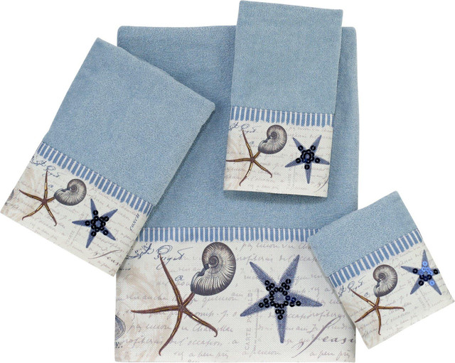 Avanti Antigua Towel Collection will add coastal charm to your bathroom. Towels feature printed seascape border with attached sequins and beads that add light & sparkle. Bath: 27'' x 50''. Hand: 16'' x 30''. Fingertip: 11'' x 18''. Washcloth: 13'' x 13''.