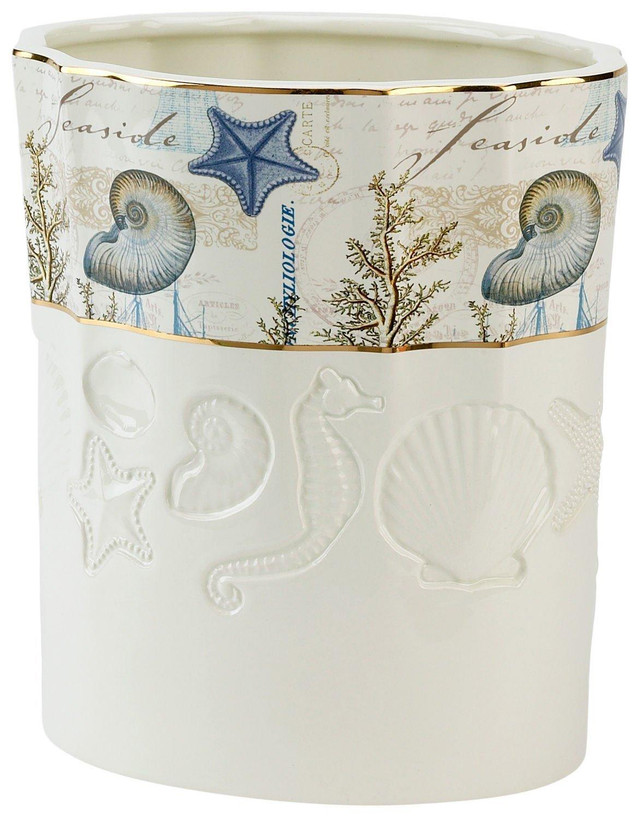 Featuring a seaside design, Antigua ceramic wastebasket by Avanti is a luxurious addition to your coastal décor. Coordinates with the Antigua bath accessories collection for a finished look. Decorative trash can measures approximately 11.75'' x 9.875'' x 9.875''.