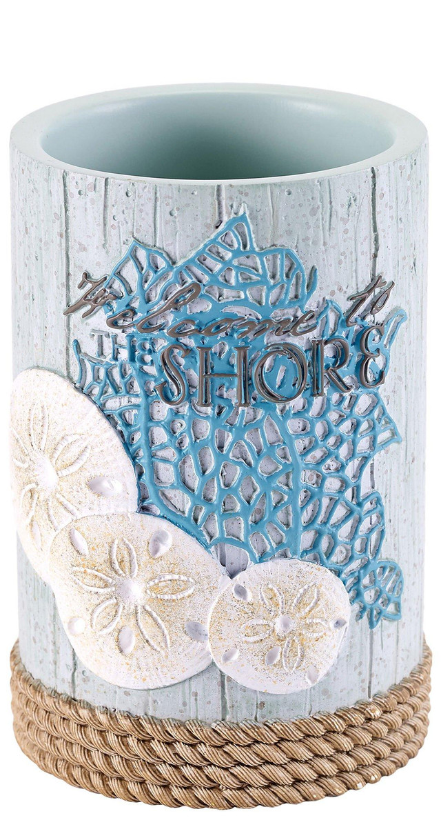 Avanti Beachcomber Tumbler is crafted in resin with incredible detail of coral and sand dollar motifs on an aqua clapboard background finished off with rope detail. Measures: 2.95'' x 2.95'' x 4.53''.