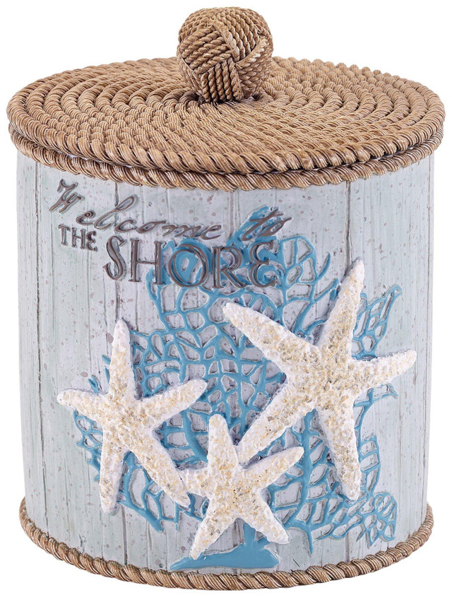 Avanti Beachcomber Covered Jar is crafted in resin with incredible detail of a coral and sand dollar motif set on an aqua clapboard background and finished with rope detail at bottom and on cover. Measures: 4.33'' x 4.33'' x 5.5''.