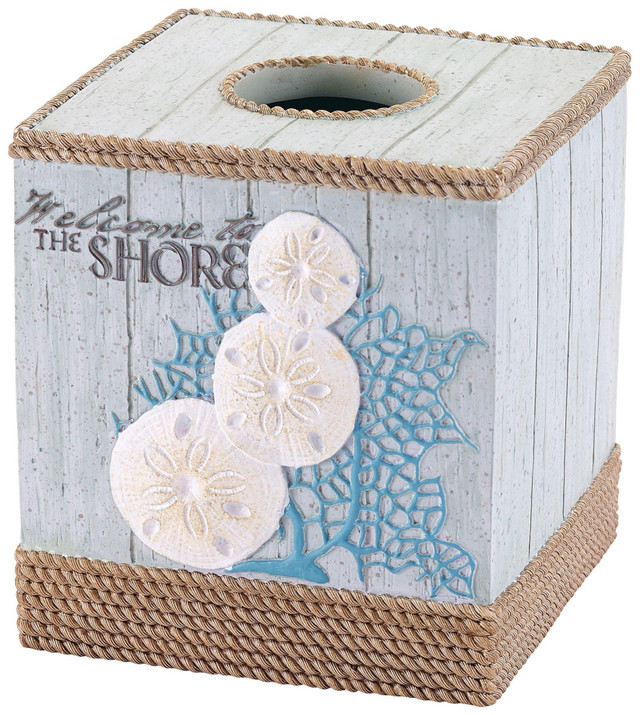 Avanti Beachcomber Lotion Pump is crafted in resin with incredible detail of a coral and sand dollar motif set on an aqua clapboard background and finished with rope detail on top and bottom. Measures: 5.9'' x 5.91'' x 6.3''.