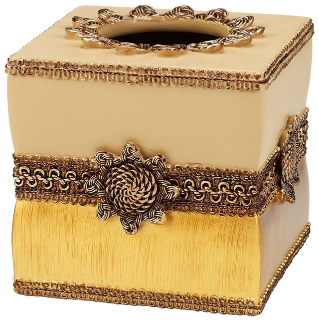 Avanti Braided Medallion Tissue Box Holder features 2-tone body that is separated by intricately carved beads and a medallion. Measures: 6.18'' x 6.18'' x 5.9''.