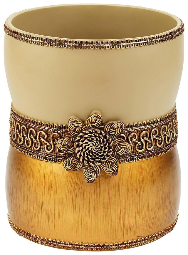 Avanti Braided Medallion Wastebasket features 2-tone body that is separated by intricately carved braids and a medallion. Measures: 8.19'' x 8.19'' x 9.65''.