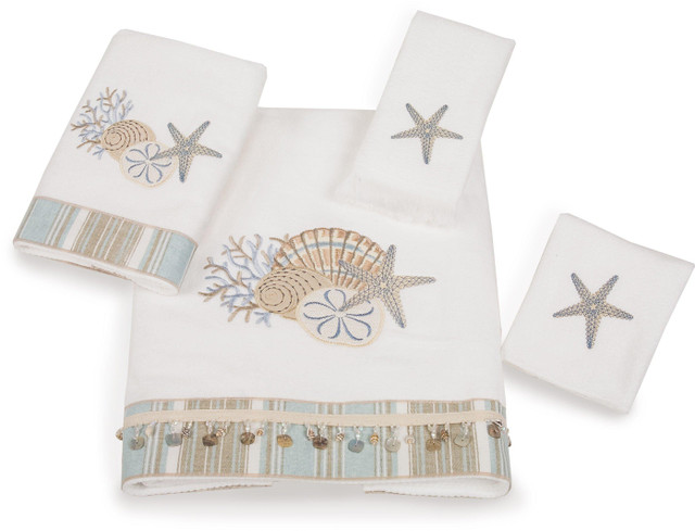 This By The Sea 100% cotton towel collection by Avanti features a combination of applique and embroidery shell motif with the bath & hand towel trimmed with a striped border. Bath: 27'' x 50''. Hand: 16'' x 30''. Fingertip: 13'' x 18''. Washcloth: 13 x 13.