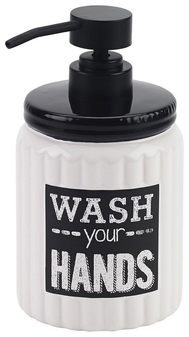 Avanti Chalk It Up Lotion Pump features a fluted white body with black trim and ''Wash your Hands'' written in ''chalk''. Measures: 3.31'' x 3.31'' x 7''.