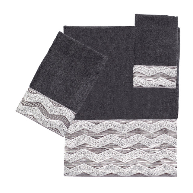 The Avanti Chevron Galaxy Towel Collection features an embellished chevron print around the border. Made of 100% Cotton with embellishments. Machine wash on gentle cycle and tumble dry low. Bath Towel: 27 in x 50 in; Hand Towel: 16 in x 30 in; Fingertip Towel: 11 in x 18 in.
