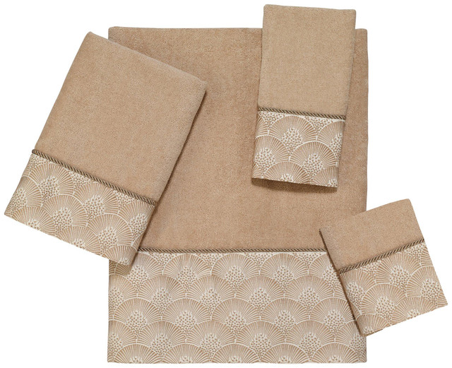The Avanti Deco Shells Hand Towel features an embroidered band of coordinating gold shells on a tonal fabric attached to a 100% cotton rattan velour towel. The band is finished with a coordinating rope trim. Towels Measure: Bath 27'' x 50'', Hand 16'' x 30'', Fingertip 11'' x 18'', and Washcloth 13'' x 13''. Each sold separately.