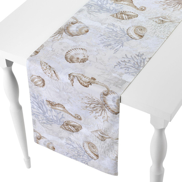 The Avanti Destin runner is a beautifully rendered underwater scene featuring seahorses, shells and coral in beiges and blues on a neutral background. Printed on a 52% polyester/48% cotton heavyweight twill cloth.
