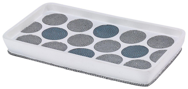 Avanti Dotted Circle Tray will add contemporary flair to any bathroom. Tray features grey and blue metallic accents on a white base in durable resin. Measures: 10.2'' x 5.6'' x 1.3''.